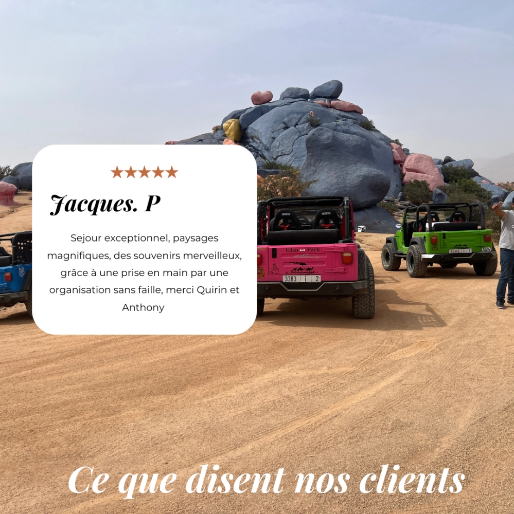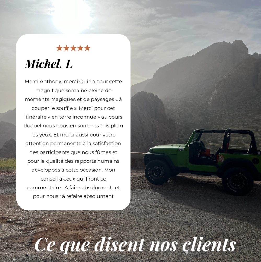 Lors de nos road trips, Omar joue le rôle d'un véritable ange gardien. Grâce à sa connaissance approfondie des jeeps et à sa capacité à anticiper les besoins de chaque voyage, il assure la sécurité et le bon déroulement de nos aventures.